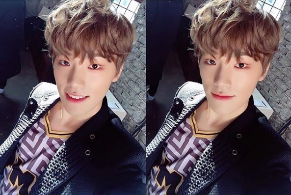 사진 속 디노는 무대 메이크업을 한 채 얼짱 각도로 카메라를 응시하고 있다. 아직 앳된 얼굴이 팬들의 귀여움을 사고 있다.