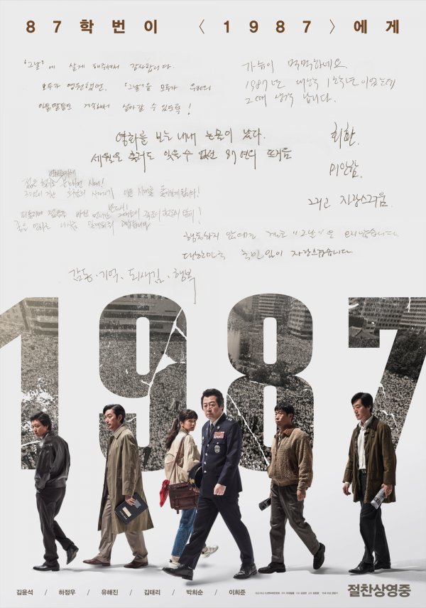 ‘1987’은 87학번부터 1987년생, 2017년의 대학생, 고등학생 관객들의 진솔한 감상평을 담은 리뷰 포스터를 공개했다. 공개된 리뷰 포스터는 각 세대별 관객들이 직접 손글씨로 남긴 생생한 리뷰가 그대로 들어가 있어 시선을 사로잡는다. ‘1987’이 전하는 묵직한 울림에 뜨겁게 공감한 관객들은 “우리에게 역사적 사실을 ‘탁’하고 보여주니 ‘억’하고 감동받게 하는 그런 영화다”, “민주주의 받들겠습니다”, “우리에게 남은 힘을 진실 뿐입니다” 등 영화 속 대사를 활용한 센스 넘치는 리뷰를 쏟아냈고, “제가 태어난 해에 치열한 역사가 있었음을 실감나게 느꼈습니다. 감동적입니다”, “기쁘게만 생각하던 제 생일이, 누군가의 희생과 민주화를 향한 열망으로 뜨거웠던 날이었을 줄은 몰랐습니다. 잊지않겠습니다”, “진실로 가는 길이 멀지라도 작은 용기들이 모이면 진실에 다다를 수 있다! 1987년의 국민들에게 감사드립니다!”, “1987년 당시 현실을 눈 앞에서 직접 본 듯한 깊은 여운을 남기는 영화. 화면 속 배우들도 울고, 나도 울고, 관객들도 울었다” 등 ‘1987’이 전하는 뜨거운 감동과 메시지에 대해 극찬했다.