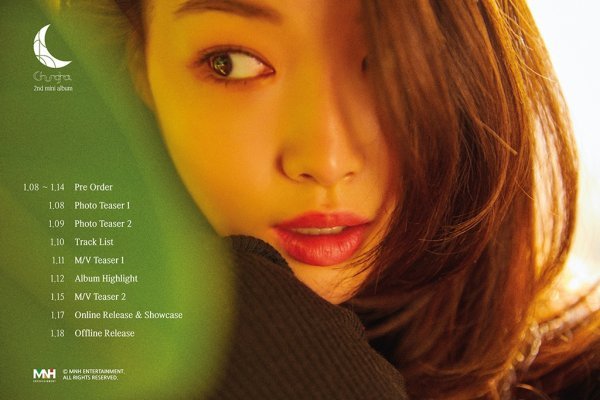 청하의 사진 좌측으로는 앨범 예약 판매 시작일부터 오프라인 음반이 발매되기까지의 전체 프로모션 일정이 담긴 타임테이블이 기재됐다.