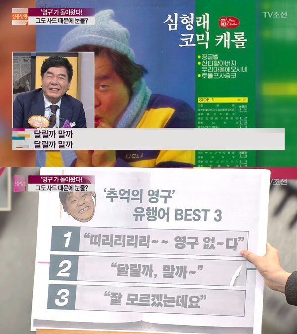 최근 방송된 TV조선 '김광일의 신통방통'은 '심형래 유행어 베스트3'를 공개했다. 베스트 1위는 "띠리리리리~ 영구 없~다", 2위는 "달릴까 말까", 3위는 "잘 모르겠는데요"가 차지했다.