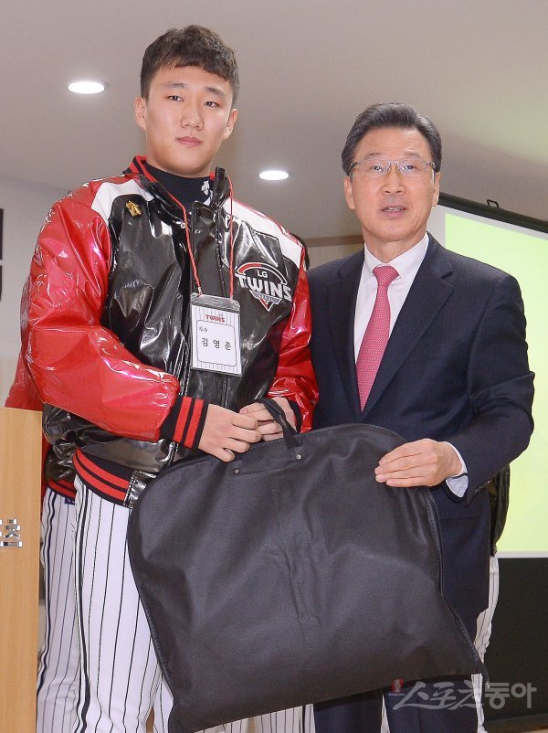 5일 서울 잠실야구장에서 LG 트윈스의 2018년 시무식이 진행됐다. 신인 드래프트 1순위로 선발된 LG 김영준이 신문범 대표이사에게 양복을 선물받고 기념촬영을 하고 있다.