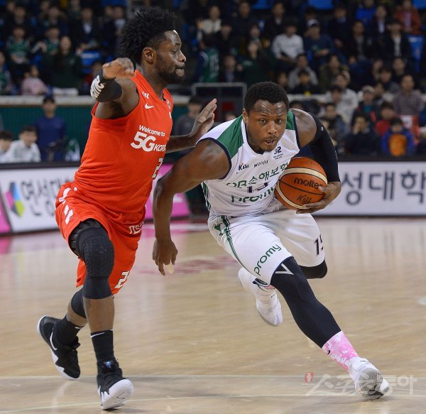 5일 서울 잠실학생체육관에서 열린 ‘2017-2018 정관장 프로농구’ 원주DB와 서울SK 경기에서 DB 버튼이 SK 화이트의 마크를 앞에 두고 돌파를 하고 있다.