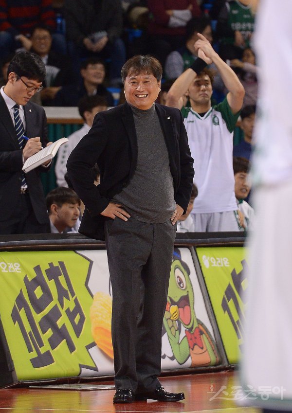 5일 서울 잠실학생체육관에서 열린 ‘2017-2018 정관장 프로농구’ 원주DB와 서울SK 경기에서 DB 이상범 감독이 미소를 지으며 경기를 지켜보고 있다.