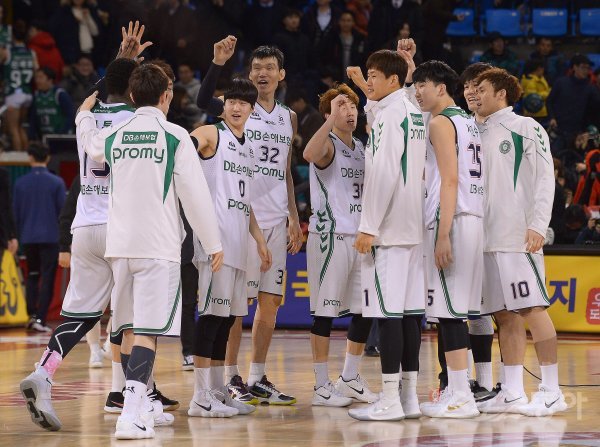 5일 서울 잠실학생체육관에서 열린 ‘2017-2018 정관장 프로농구’ 원주DB와 서울SK 경기에서 원주DB가 91-85로 승리하며 단독 1위로 올라섰다. 경기 후 원주DB 선수들이 기쁨을 나누고 있다.