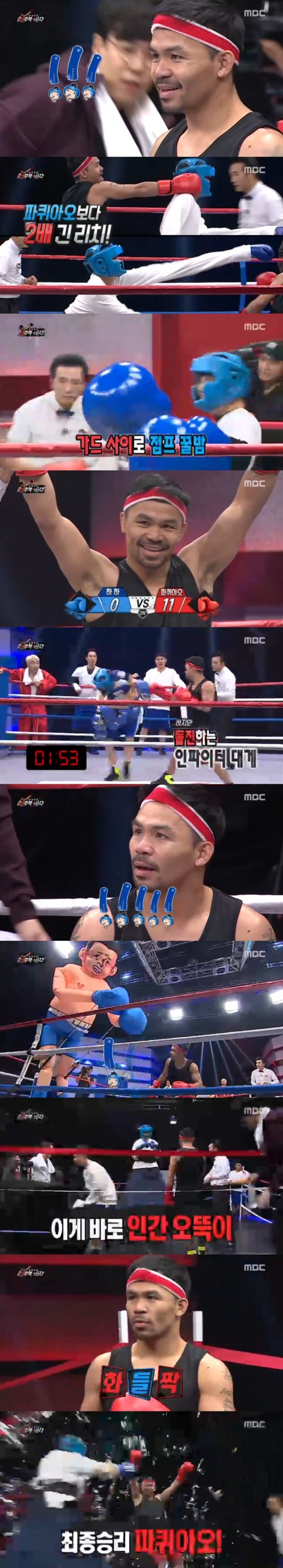 두 번째 선수로 나선 하하는 파퀴아오의 10배나 주먹을 들고 나왔다. 이에 파퀴아오는 초반 공격을 하지 못했다. 그러나 하하 역시 자신의 큰 주먹 때문에 오히려 자신의 공격 포인트를 누르는 등 실수를 저질렀고 11대 0으로 패배했다.