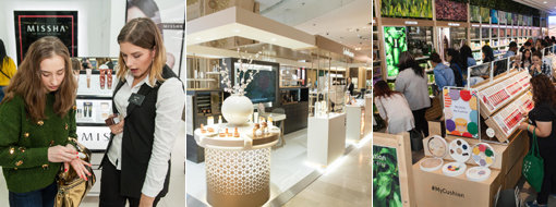 벨라루스 수도 민스크에 오픈한 미샤 매장을 찾은 현지 고객들과 프랑스 파리 갤러리 라파예트 백화점에 단독 매장을 연 아모레퍼시픽 설화수 매장 내부 전경. 미국 뉴욕에 오픈한 이니스프리 플래그십 스토어를 찾은 현지 고객들(왼쪽부터). 뷰티업계가 중국 외에 북미, 유럽, 중동, 남미 등의 해외 시장 공략에 힘쓰는 글로벌 전략 재편에 나섰다. 사진제공|미샤·아모레퍼시픽·이니스프리
