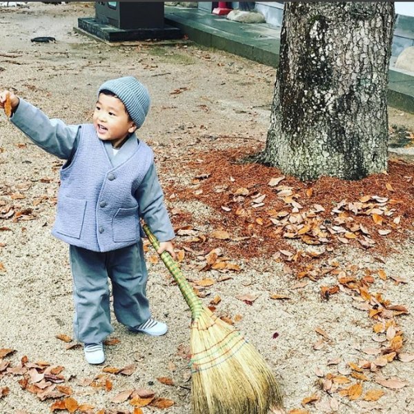 사진 속 승재 군은 동자승 옷을 입고 빗자루 질을 하는 모습이다. 그 중 발견한 낙엽이 마음에 드는지 즐거운 얼굴을 하고 낙엽을 자랑하고 있다.
