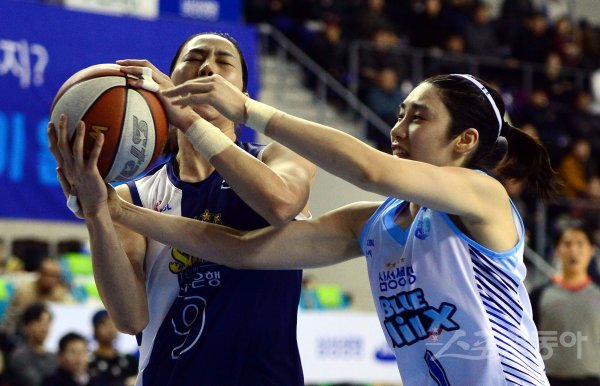 8일 경기도 용인실내체육관에서 열린 ‘신한은행 2017-2018 여자프로농구’ 용인 삼성생명과 인천 신한은행의 경기에서 삼성생명 박하나와 신한은행 곽주영이 리바운드를 다투고 있다.