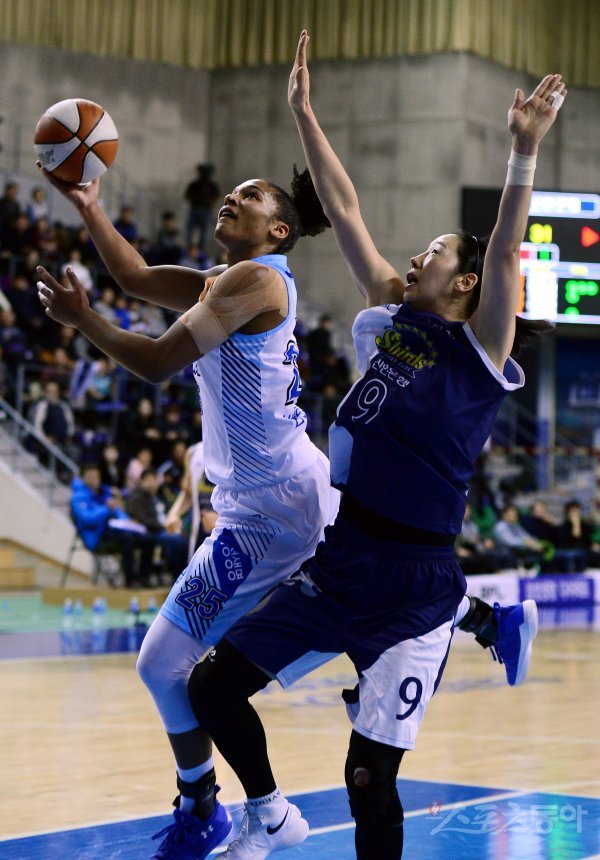 8일 경기도 용인실내체육관에서 열린 ‘신한은행 2017-2018 여자프로농구’ 용인 삼성생명과 인천 신한은행의 경기에서 삼성생명 토마스가 신한은행 곽주영의 수비를 피해 슛을 쏘고 있다.