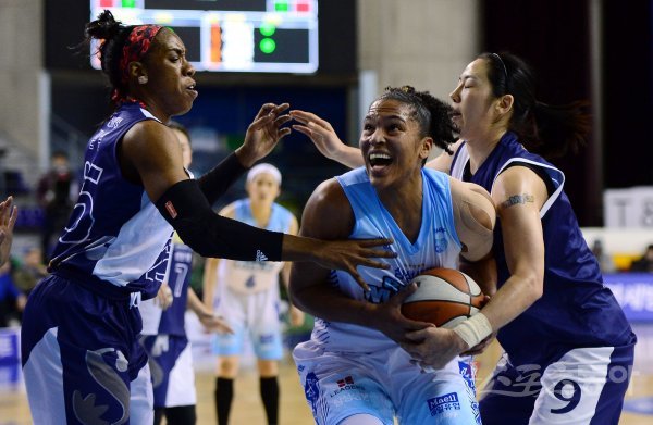 8일 경기도 용인실내체육관에서 열린 ‘신한은행 2017-2018 여자프로농구’ 용인 삼성생명과 인천 신한은행의 경기에서 삼성생명 토마스가 신한은행 쏜튼과 곽주영의 수비를 피해 돌파하고 있다.