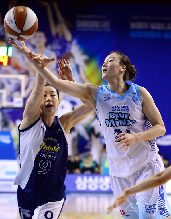 8일 경기도 용인실내체육관에서 열린 ‘신한은행 2017-2018 여자프로농구’ 용인 삼성생명과 인천 신한은행의 경기에서 삼성생명 배혜윤이 신한은행 곽주영의 수비를 피해 슛을 쏘고 있다.