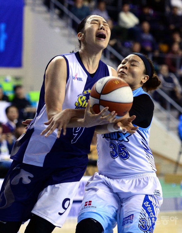 8일 경기도 용인실내체육관에서 열린 ‘신한은행 2017-2018 여자프로농구’ 용인 삼성생명과 인천 신한은행의 경기에서 신한은행 곽주영이 슛할 때 삼성생명 김한별의 반칙을 얻어내고 있다.