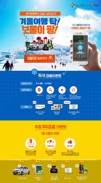 또한 추가 응모자를 대상으로 자동차, AI 스피커 등의 추가경품 당첨 기회를 제공하며, 이벤트 기간 중 여러 관광지를 방문해 방문인증 횟수가 늘어날수록 추가경품 당첨 확률이 높아진다. 경품에 응모할 수 있는 230개 국내 대표관광지는 ‘겨울 국내여행 캠페인’ 홈페이지에 15일부터 보물지도의 형태로 확인이 가능하다.