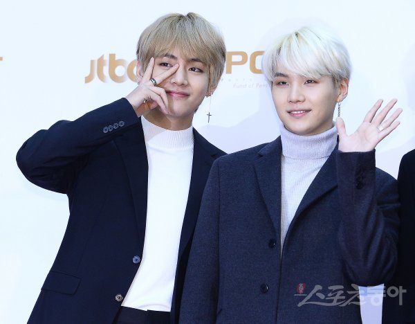 방탄소년단 뷔와 슈가(오른쪽)가 10일 경기도 고양시 일산 킨텍스에서 열린 제32회 골든디스크 시상식 레드카펫에 참석해 포즈를 취하고 있다.