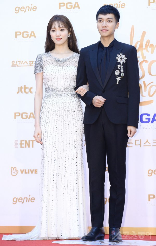 배우 이성경과 이승기(오른쪽)가 10일 경기도 고양시 일산 킨텍스에서 열린 제32회 골든디스크 시상식 레드카펫에 참석해 포즈를 취하고 있다.