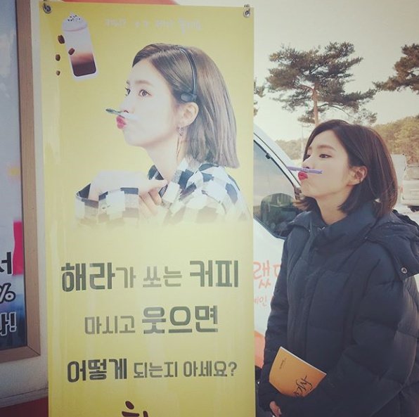 사진 속 신세경은 팬들이 보낸 것으로 보이는 커피 트럭 앞에서 판넬 속 자신의 모습을 흉내내고 있다. 판넬에는 '해라가 쏘는 커피 마시고 웃으면 어떻게 되는지 아세요? 더 힘이 납니다.','신세경 갤러리에서 흑기사 시청률 20% 돌파를 기원합니다.'라고 쓰여 있어 눈길을 끌었다.