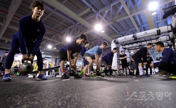 10일 충북 진천 국가대표선수촌에서 열린 2018 평창동계올림픽대회 G-30 미디어데이에서 아이스하키팀 선수들이 체력단련 훈련을 하고 있다.
