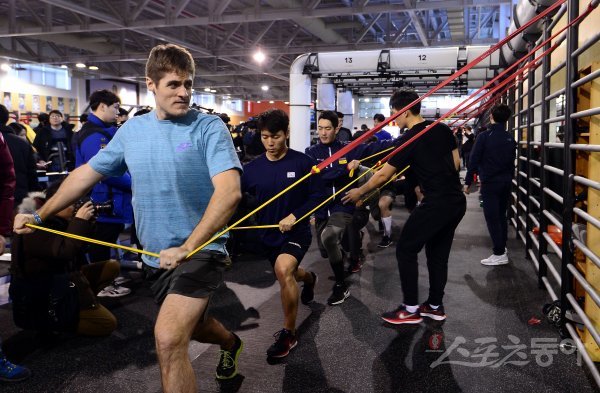 10일 충북 진천 국가대표선수촌에서 열린 2018 평창동계올림픽대회 G-30 미디어데이에서 아이스하키팀 선수들이 체력단련 훈련을 하고 있다.