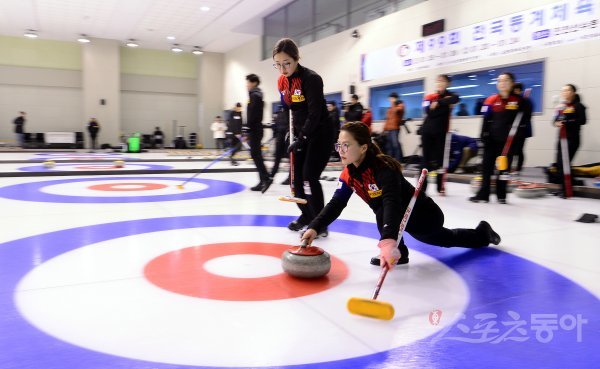 10일 충북 진천 국가대표선수촌에서 열린 2018 평창동계올림픽대회 G-30 미디어데이에서 컬링 대표팀 선수들이 공개 훈련을 하고 있다.