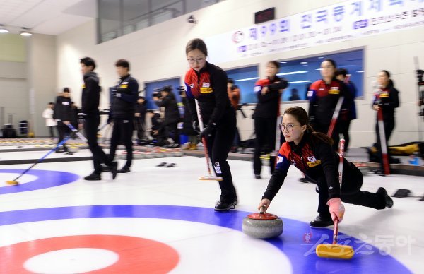 10일 충북 진천 국가대표선수촌에서 열린 2018 평창동계올림픽대회 G-30 미디어데이에서 컬링 대표팀 선수들이 공개 훈련을 하고 있다.