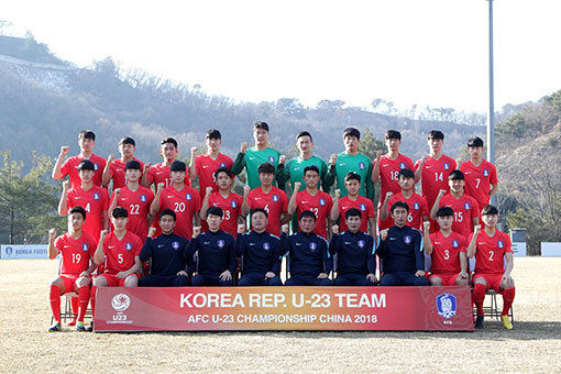 김봉길 감독이 이끄는 U-23 대표팀이 11일 중국 장수성에서 ‘2018 AFC U-23 챔피언십’ 1차전을 치른다. 상대는 박항서 감독이 지휘봉을 잡은 베트남이다. 5일 출정식에서 결의를 다지고 있는 선수단. 사진제공 | 대한축구협회
