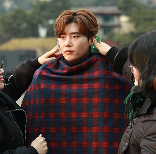 야외 촬영 중으로 보이는 이종석이 손난로와 담요 등에 꽁꽁 싸매져 있다.