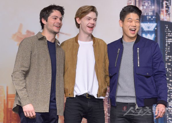 배우 딜런 오브라이언과 토마스 브로디-생스터, 이기홍(왼쪽부터)이 11일 서울 영등포구 여의도 콘래드 호텔 그랜드 볼룸에서 열린 영화 ‘메이즈 러너 : 데스 큐어’ 내한 기자 간담회에서 포즈를 취하고 있다.