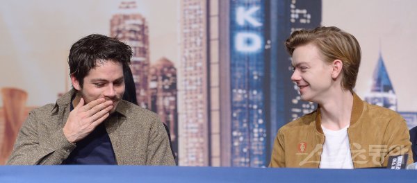 배우 딜런 오브라이언과 토마스 브로디-생스터(오른쪽)가 11일 서울 영등포구 여의도 콘래드 호텔 그랜드 볼룸에서 열린 영화 ‘메이즈 러너 : 데스 큐어’ 내한 기자 간담회에서 대화를 나누고 있다.
