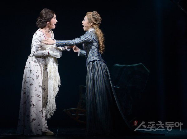 배우 정선아와 강지혜(오른쪽)가 12일 서울 서초구 예술의전당 오페라극장에서 열린 뮤지컬 ‘안나 카레니나’ 프레스콜에서 열정적인 연기를 펼치고 있다.