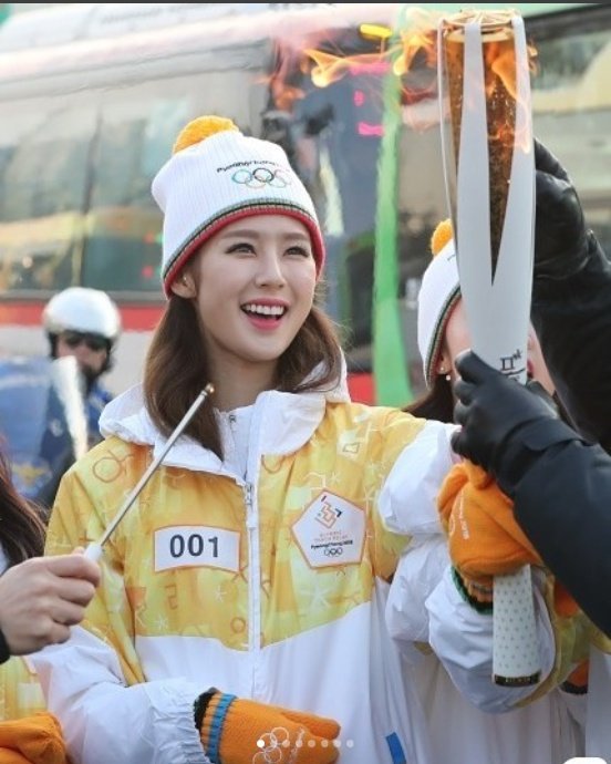 사진 속 그녀는 모자와 장갑 등 올림픽 성화봉송 주자 복장을 깜찍하게 소화한 채 환한 표정으로 성화를 건네받고 있다.