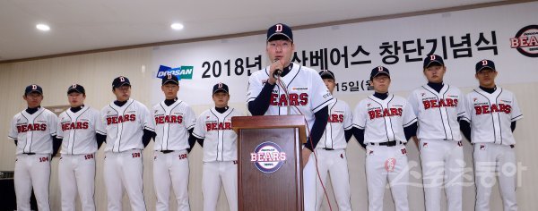 신인 선수들을 대표해 곽빈이 인사말을 하고 있다.