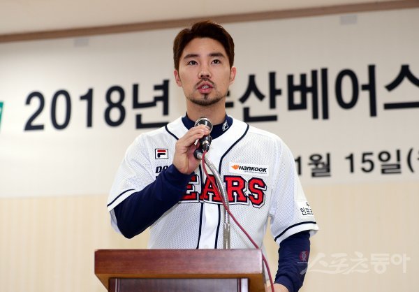 주장 오재원이 인사말을 하고 있다.