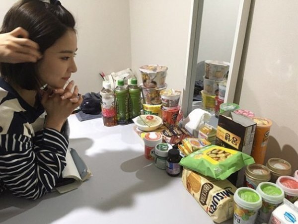 사진 속 신세경은 눈 앞에 한가득 쌓인 간식들을 보고 행복한 미소를 짓고 있다. 두 손을 모은 채 간식에 눈을 떼지 못하는 신세경의 모습이 귀여움을 자아냈다.