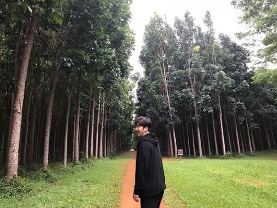 사진 속 윤계상은 우거진 숲 사이에서 밝은 미소를 하고 있다. 미세먼지 비상저감조치가 내려진 15일 현재와 상반 되는 배경이 눈길을 끌었다.