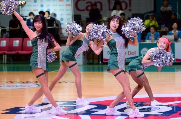 15일 경기도 부천실내체육관에서 열린 ‘신한은행 2017-2018 여자프로농구’ 부천 KEB하나은행과 아산 우리은행의 경기에서 KEB하나은행 치어리더가 화려한 공연을 선보이고 있다.