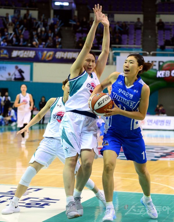 15일 경기도 부천실내체육관에서 열린 ‘신한은행 2017-2018 여자프로농구’ 부천 KEB하나은행과 아산 우리은행의 경기에서 우리은행 임영희가 KEB하나은행 김단비의 수비를 피해 돌파하고 있다.