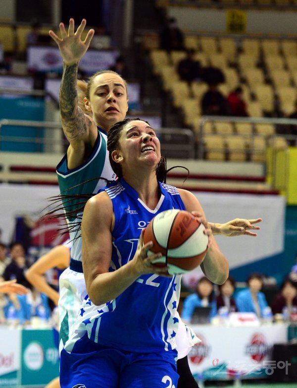 15일 경기도 부천실내체육관에서 열린 ‘신한은행 2017-2018 여자프로농구’ 부천 KEB하나은행과 아산 우리은행의 경기에서 우리은행 어천와가 KEB하나은행 과트미의 수비를 피해 슛을 쏘고 있다.