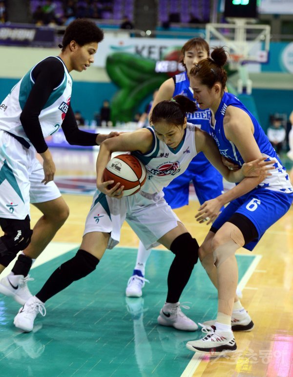 15일 경기도 부천실내체육관에서 열린 ‘신한은행 2017-2018 여자프로농구’ 부천 KEB하나은행과 아산 우리은행의 경기에서 KEB하나은행 염윤아가 우리은행 최은실과 볼 다툼을 벌이고 있다.