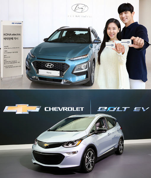 현대차 코나 일렉트릭(위쪽)과 쉐보레 볼트 EV가 나란히 15일 사전계약에 돌입했다. 1회 충전으로 코나 일렉트릭은 390km 이상, 볼트 EV는 383km의 주행이 가능한 장거리 전기차다. 사진제공|현대차·한국지엠