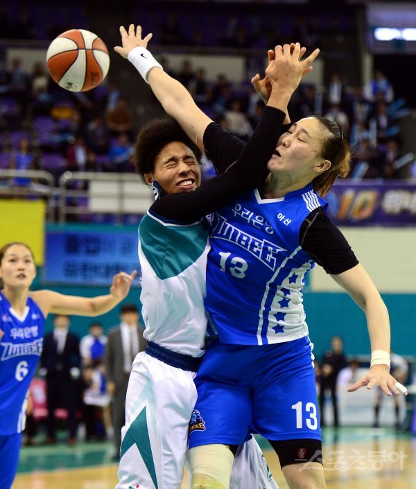 15일 경기도 부천실내체육관에서 열린 ‘신한은행 2017-2018 여자프로농구’ 부천 KEB하나은행과 아산 우리은행의 경기에서 KEB하나은행 해리슨과 우리은행 김정은이 리바운드를 다투고 있다.