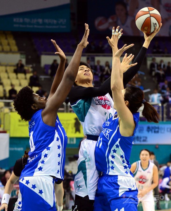 15일 경기도 부천실내체육관에서 열린 ‘신한은행 2017-2018 여자프로농구’ 부천 KEB하나은행과 아산 우리은행의 경기에서 KEB하나은행 해리슨이 우리은행 윌리엄스, 임영희의 수비를 피해 슛을 쏘고 있다.
