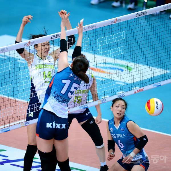 16일 서울 장충체육관에서 열린 ‘2017-18 도드람 V리그’ 여자부 현대건설과 GS칼텍스 경기에서 현대건설 양효진이 GS칼텍스의 서브 리시브가 직접 넘어오자 밀어넣기 공격을 성공시키고 있다.