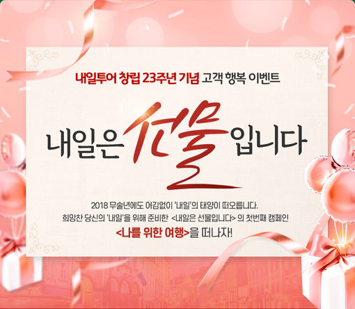 자유여행 전문 내일투어가 창립 23주년을 맞아 2월1일까지 고객 행복 이벤트를 실시한다. 이벤트 캠페인 주제는 2018년 희망찬 고객들의 ‘내일’을 위해 준비한 ‘나를 위한 여행’이다.