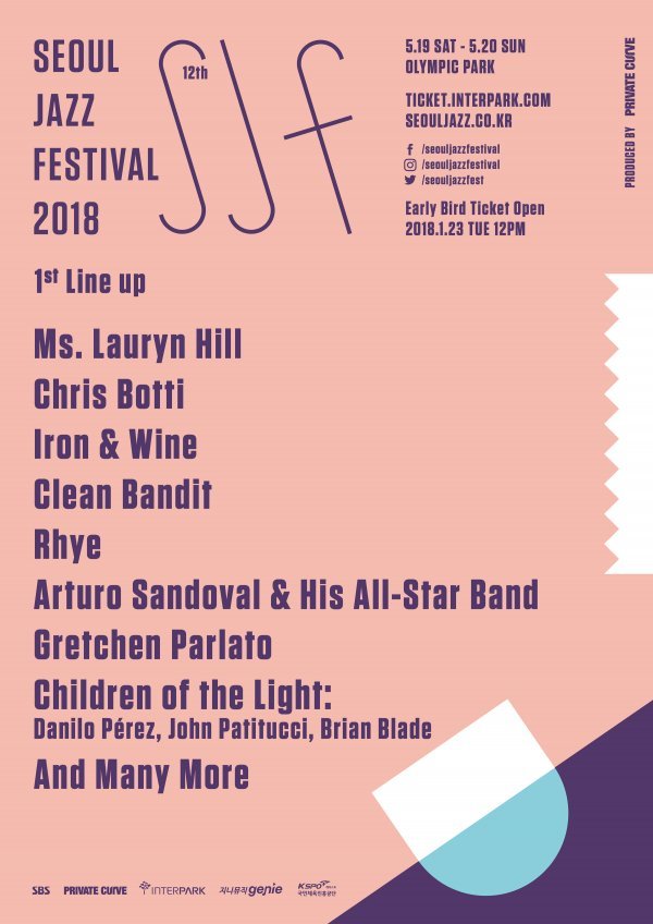 화려하고 차별성 있는 라인업 구성으로 명성을 얻고 있는 서울재즈페스티벌이 오는 5월 19일과 20일 양일간 제12회 서울재즈페스티벌 2018을 개최를 앞두고 1차 라인업 8팀을 공개했다. 1차 라인업에는 재즈를 바탕으로 소울과 팝을 가미한 음악으로 이 시대 최고의 네오 소울 디바로 불리는 미스로린힐 (Ms. Lauryn Hill), 따뜻하고 섬세한 감성으로 사랑받는 대표적인 음유시인 아이언 & 와인 (Iron & Wine), 수많은 재즈 어워즈를 휩쓴 최고의 여성 재즈 보컬리스트 그레첸팔라토(Gretchen Parlato)의 첫 내한이 포함되어 있다. 또한, 재즈와 팝을 넘나드는 트럼펫 솔리스트 크리스보티(Chris Botti), 그래미 어워즈를 9번 수상한 세계적인 라틴 재즈계 트럼펫 주자 아투로산도발& 올 스타 밴드 (Arturo Sandoval & His All-Star Band)와 다니엘 페레즈(Danilo Pérez) 존 패티투치(John Patitucci), 브라이언 블래이드(Brian Blade) 트리오로 구성된 칠드런오브더라이트(Children of the Light) 그리고, 클래식과 일렉트로닉 음악의 신선하고 세련된 조합으로 그래미 어워즈 베스트 댄스곡 수상은 물론, 각종 차트를 장악한 천재적인 그룹 클린밴딧(Clean Bandit), 서정적인 감성으로 해외는 물론, 국내에서도 탄탄한 팬 베이스를 구축하고 있는 라이(Rhye) 등 수준 높은 음악성의 세계적인 아티스트들이 차례로 이름을 올렸다.