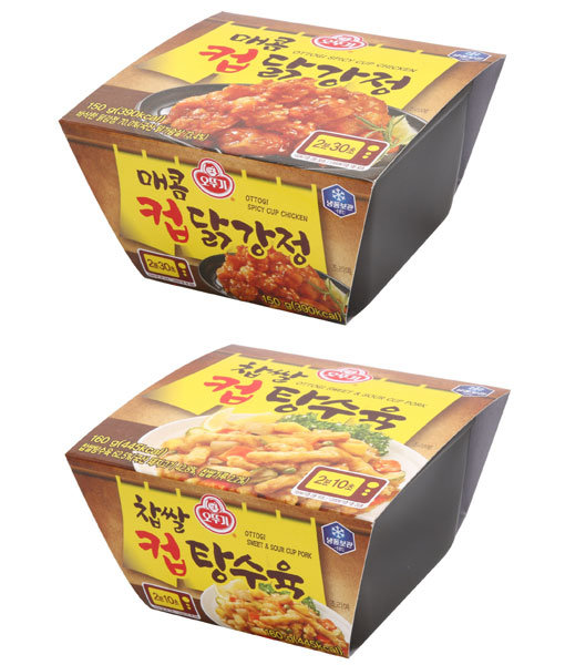 오뚜기 ‘매콤 컵 닭강정’은 국내산 통 닭가슴살을 바삭하게 튀겨 매콤달콤한 소스에 버무린 제품이다. ‘찹쌀 컵 탕수육’은 국내산 돼지고기를 엄선해 바삭하게 튀겨낸 후 새콤달콤 탕수육 소스를 듬뿍 더했다. 현재까지 시장에 출시된 컵 탕수육 제품은 오뚜기가 유일하다.