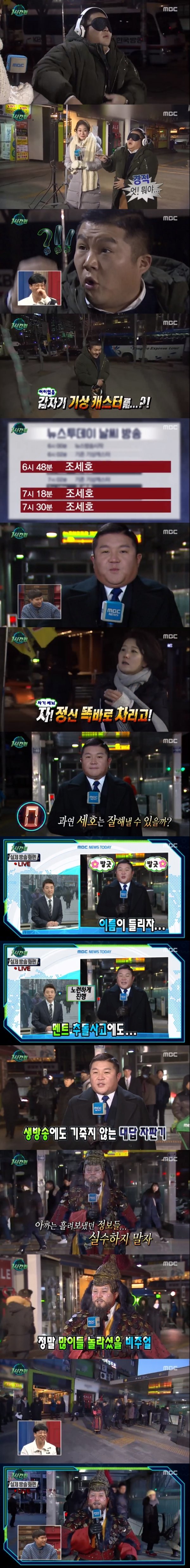 끝으로 방송 전부터 화제를 모은 조세호의 기상캐스터 변신 과정이 공개됐다. 체감 기온 영하 20도 넘는 추운 날씨에 조세호는 어쩔 줄 몰라했다. 그는 눈앞에 있는 이귀주 기상캐스터를 보고 깜짝 놀랐다. 이귀주 캐스터는 “한 시간 뒤 ‘뉴스투데이’에서 생방송으로 날씨를 전해야 한다”고 말해 조세호를 놀라게 했다. 조세호는 “제가요?”라고 대답했고, 총 3회 예보 멘트를 직접 써야 한다는 소식에 조세호는 어쩔 줄 몰라했다. 조세호는 이귀주 캐스터를 보며 “무슨 상황인거야”를 되뇌었다.