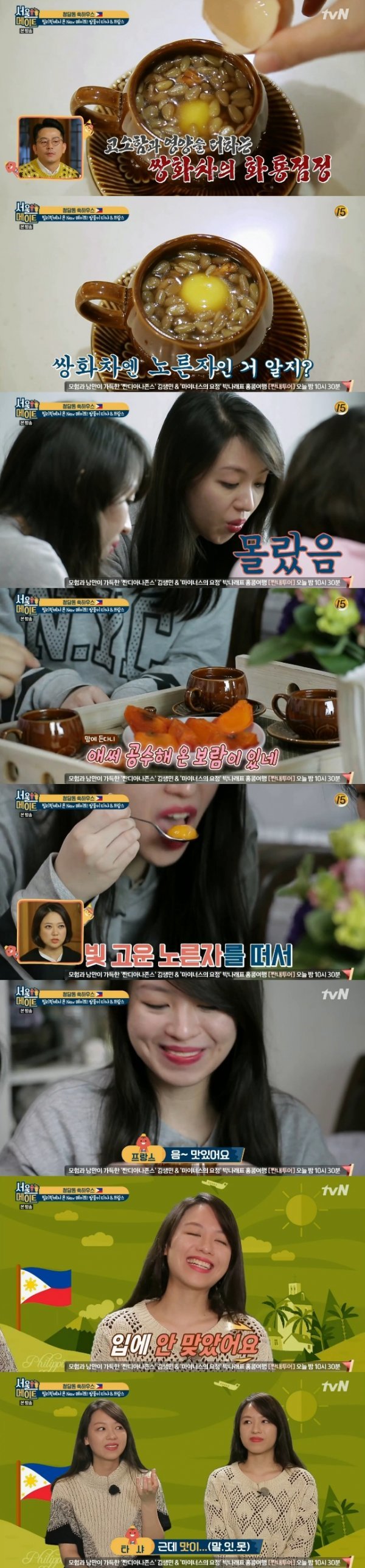 이날 두 번째 메이트는 필리핀에 온 쌍둥이 자매 타샤와 프랑스였다. 이에 김숙은 ‘웰컴티’로 쌍화탕을 준비했다. 추운 한국 날씨에 잘 적응하라는 의미에서였다. 그 과정에서 쌍화탕에 노른자를 띄웠지만, 이는 아쉬움을 남겼다. 쌍화탕 특유의 향기와 노른자의 식감이 외국인에게는 맞지 않은 것.