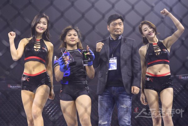 20일 오후 서울 강서구 화곡동 KBS 아레나홀에서 글리몬FC 02(GFC 02) 노바매치 양서우와 데니스 잼보앙가의 스트로급 3경기에서 잼보앙가가 1라운드 TKO승리를 거뒀다. 잼보앙가가 트로피를 들고 포즈를 취하고 있다.