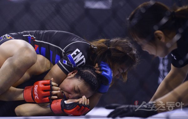20일 오후 서울 강서구 화곡동 KBS 아레나홀에서 글리몬FC 02(GFC 02) 노바매치 양서우와 데니스 잼보앙가의 스트로급 3경기가 열렸다. 양서우가 잼보양가의 초크에 고통스러워 하고 있다. 양서우는 이번 글리몬FC 02를 통해 프로데뷔 첫경기를 치렀다.
