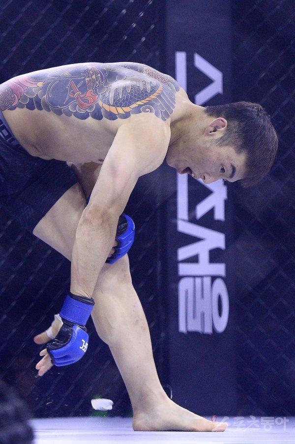 20일 오후 서울 강서구 화곡동 KBS 아레나홀에서 글리몬FC 02(GFC 02) 메인매치 이지인과 홍승민의 벤텀급 1경기가에서 홍승민이 2라운드 TKO승을 거둔 후 마우스피스를 던지며 포효하고 있다.